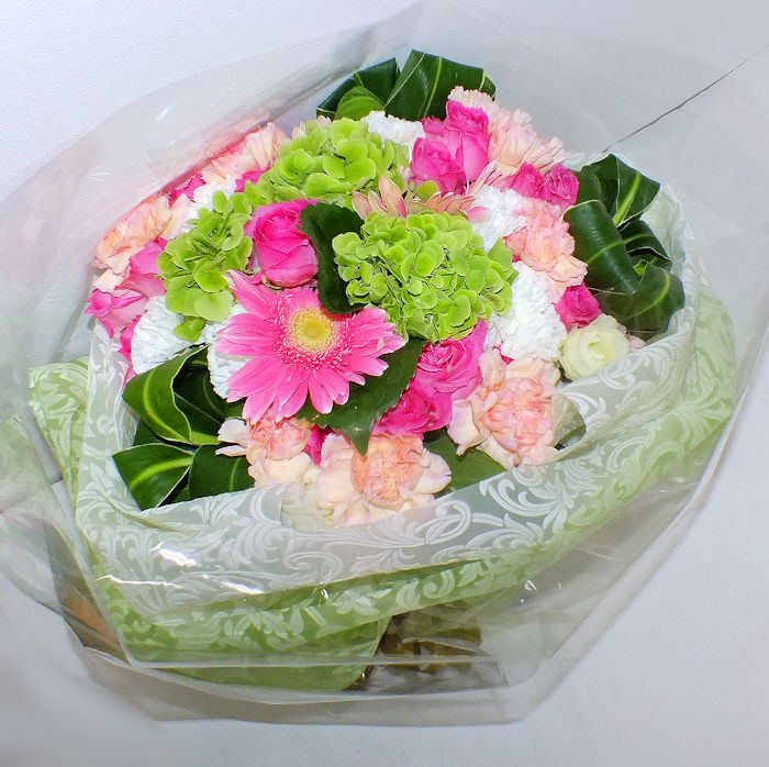 かわいいピンク系のバラやガーベラをメインに、優しいグリーンのアジサイをつかったとても
