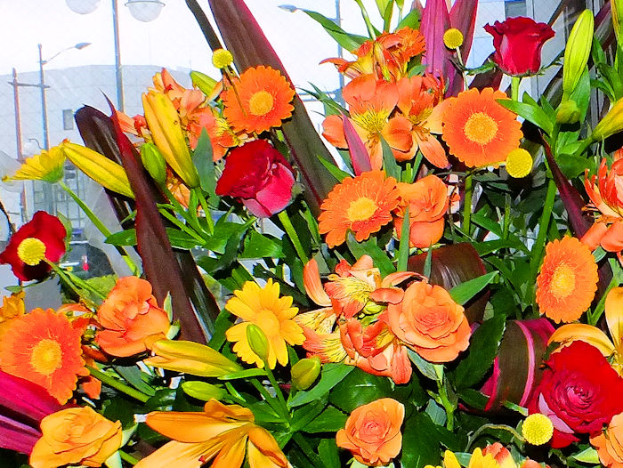 オレンジ系のユリをメインに赤とオレンジのバラを使い銅葉のドラセナで引き締め、