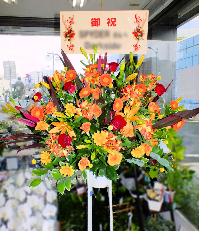 泉町へお届けいたしました御祝スタンド花1段オレンジ系です♥