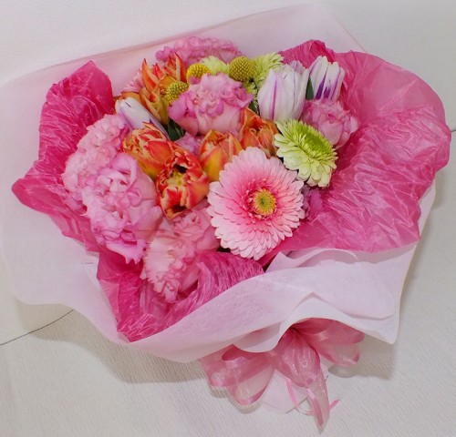 本日青柳町へお届けいたしました送別用花束です♥ 八重咲チューリップの薄紫とサーモンピンクをメインにしたピンク系のかわいい花束です♪ ご注文ありがとうございました♥